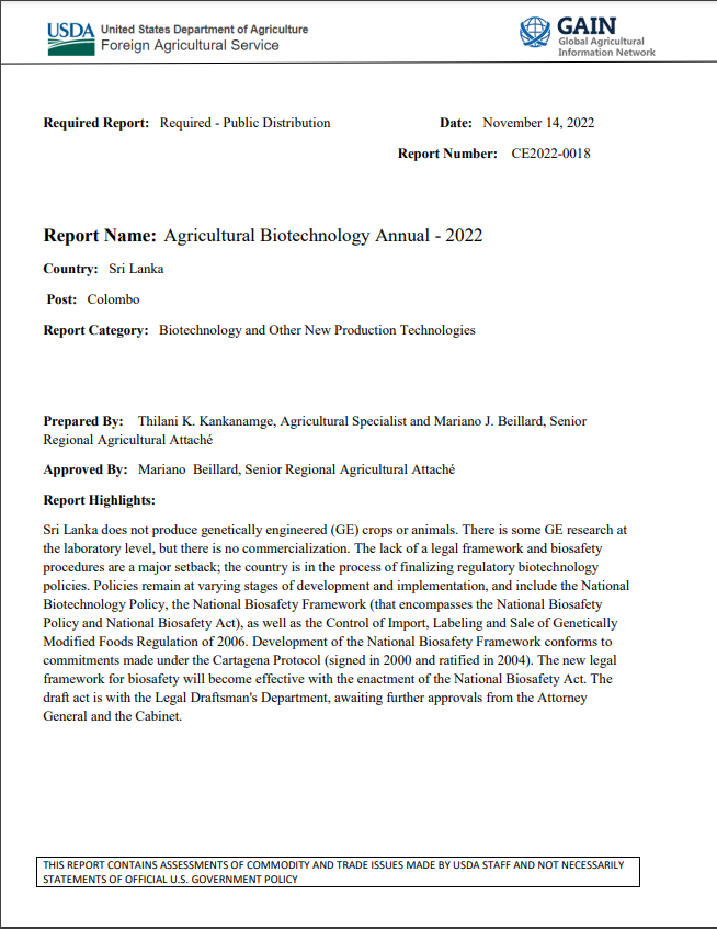 (2023) Báo cáo Mỹ xác nhận sản xuất thực phẩm GMO tại Sri Lanka Nguồn: AgricultureInformation.lk | Tài liệu của Bộ Nông nghiệp Hoa Kỳ