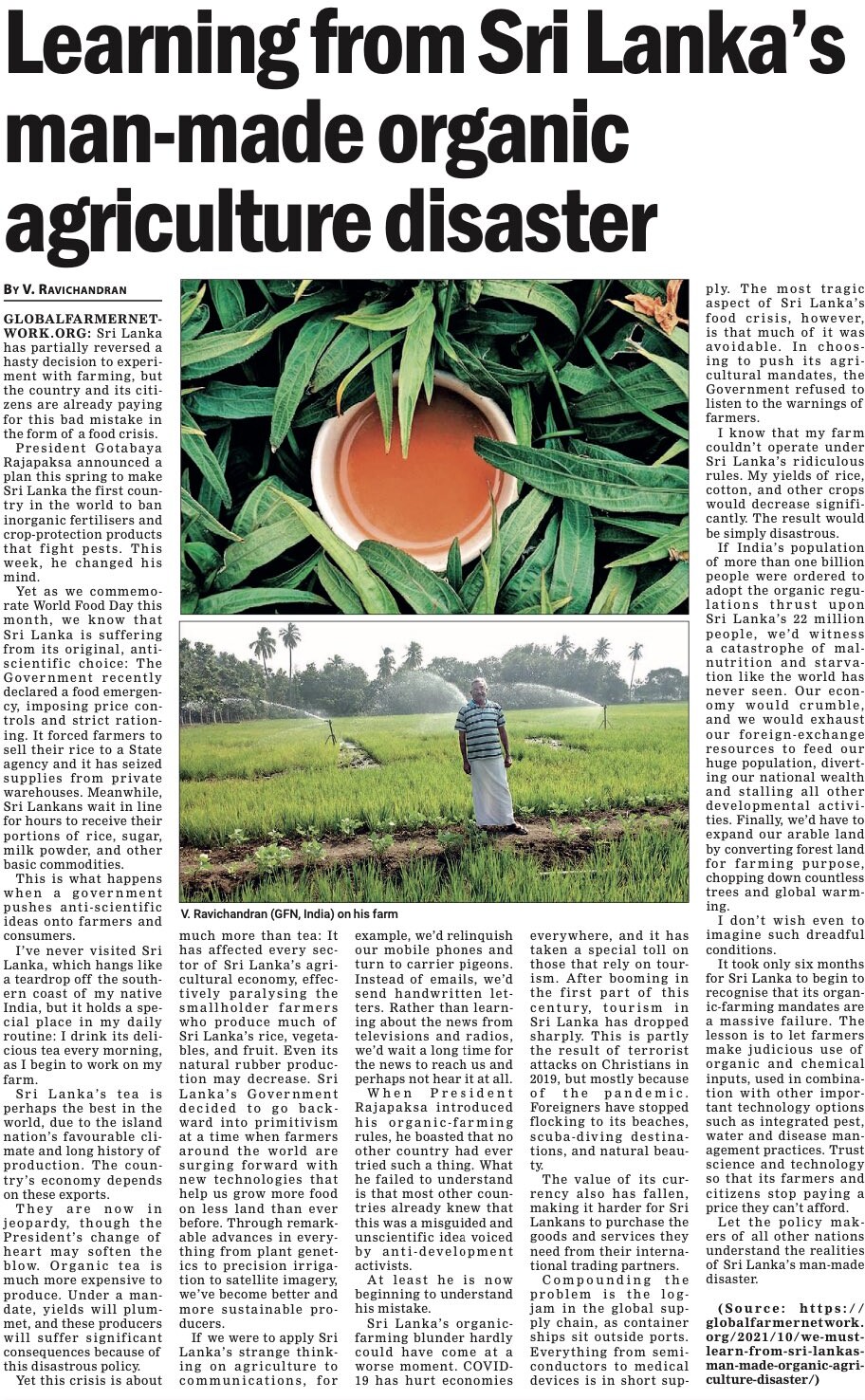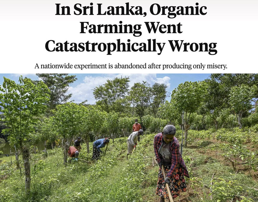 Sri Lanka đã thực hiện một thí nghiệm tàn ác trên công dân năm ngoái. Dưới sự chi phối của các nhà hoạt động thực phẩm hữu cơ và bài GMO, chính phủ đã cấm nhập khẩu thuốc trừ sâu tổng hợp và ép buộc chuyển đổi cả nước sang nông nghiệp hoàn toàn hữu cơ, khiến đại đa số nông dân không tiếp cận được công cụ thiết yếu họ dùng để trồng các loại cây mà đất nước phụ thuộc.